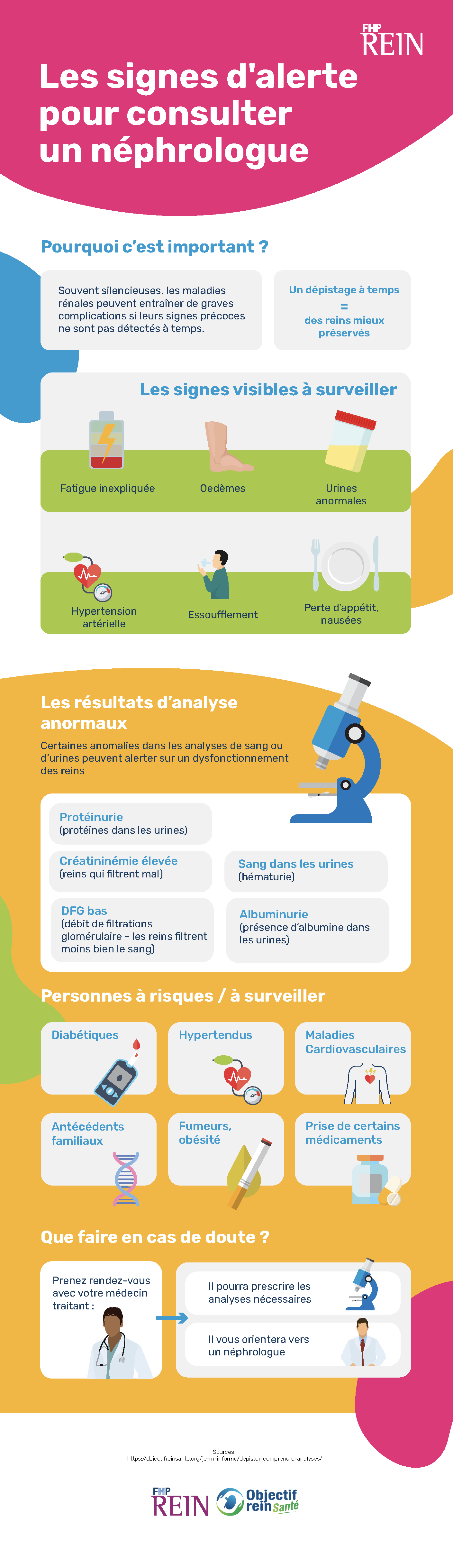 En présence de signes d’alerte ou d’anomalies dans les analyses, il est important de consulter rapidement son médecin traitant. Celui-ci pourra prescrire les examens complémentaires nécessaires et, si besoin, orienter le patient vers un néphrologue, spécialiste des maladies rénales.